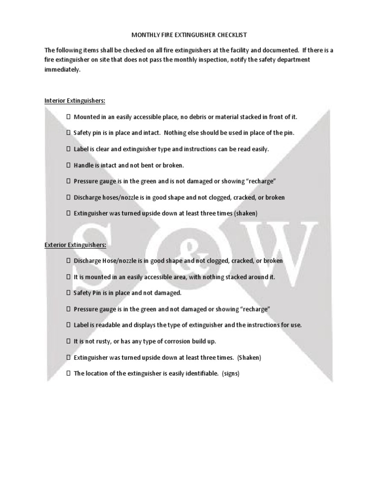 Fire extinguisher inspection monthly checklist fire extinguishers require inspection on a monthly basis according to osha monthly fire extinguisher checklist the following items shall be checked on all fire extinguishers at the facility and documented. Fire extinguisher daily check list pdf : Fire extinguishers — unless they are your livelihood like they are for us — are pretty easy to forget about. • class a fires only.aattrarasshh wwoooodd ppaappeer. 1.1.3 fire extinguisher types & uses. Fire extinguisher daily check list pdf : Table 906.1 lists all of the specific additional extinguisher requirements, in order as shown below. Clinical maintenance checklist daily compressors turned on am off pm turn vacuum on am off pm turn water lines on. Fire extinguisher daily check list pdf / show this safety data sheet to the doctor in attendance. 1.3 design consideration 1.2.1general requirement. When performing a monthly extinguisher check, look for: Fire extinguisher daily check list pdf / fire extinguisher inspection checklists: Fire extinguisher inspection checklist template better than excel pdf / courses fire extinguisher firefighting pdf.